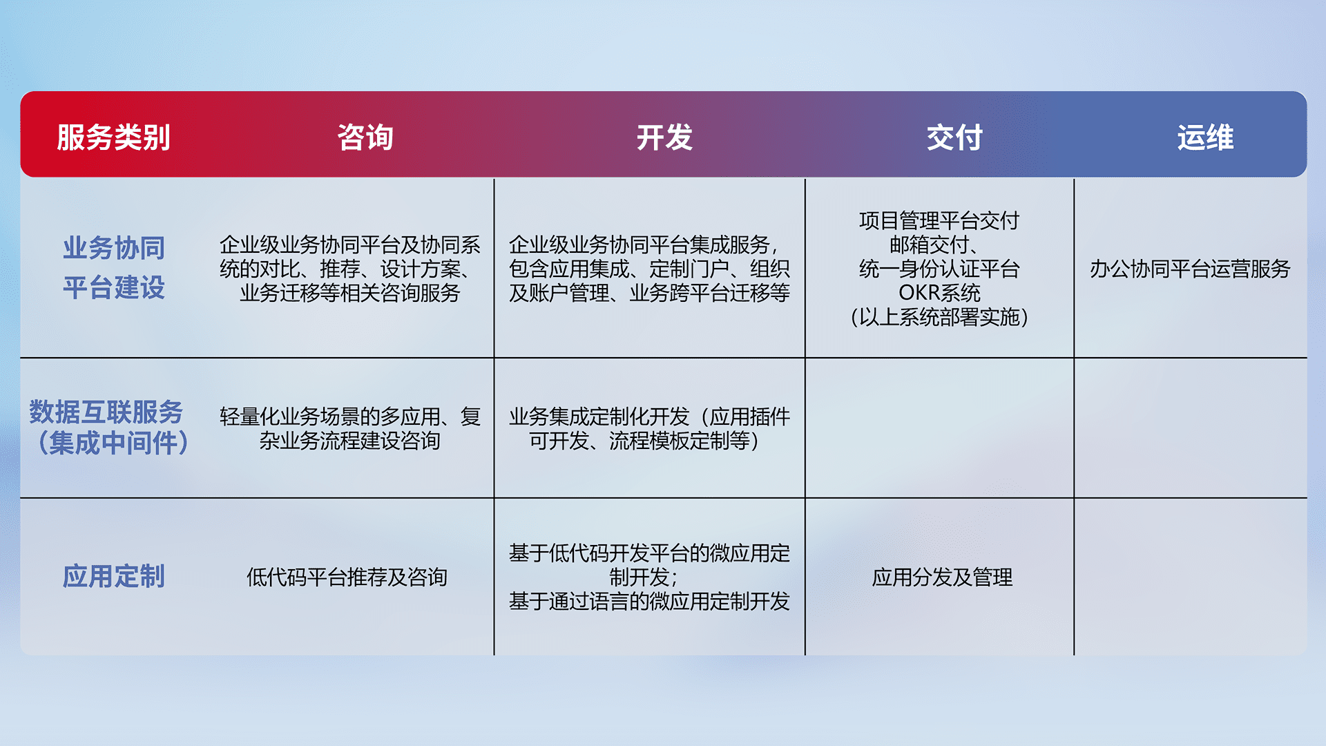 针对钉钉、、、、企微、、、、IDaas等平台级产品提供产品的规划、、、、方案、、、、交付、、、定制化开发等服务,,,实现如统一协同办公、、智能客户服务、、、、混合会议管理、、、、智能数据查询、、、等业务场景,,,,实现数字化转型。。。